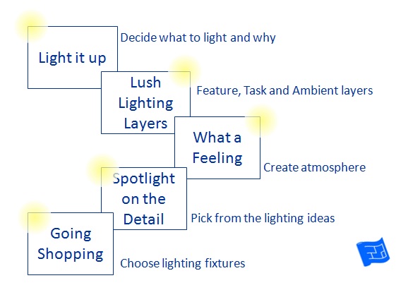 Trang bị danh sách các ý tưởng mà bạn muốn tạo ra trong thiết kế chiếu sáng gia đình, hãy truy cập các trang ý tưởng chiếu sáng phòng và duyệt qua các ý tưởng chiếu sáng được liệt kê cho từng phòng. Liên hệ kiến ​​trúc sư hoặc chuyên gia thiết kế của bạn biết bạn muốn ánh sáng gì trong mỗi phòng vì kế hoạch thiết kế chiếu sáng là một phần của bản vẽ xây dựng. Có thiết kế và hiểu biết về ánh sáng sẽ giúp cho bạn có định hướng, quyết định đúng đắn trong việc bố trí ánh sáng không gian nhà bạn.